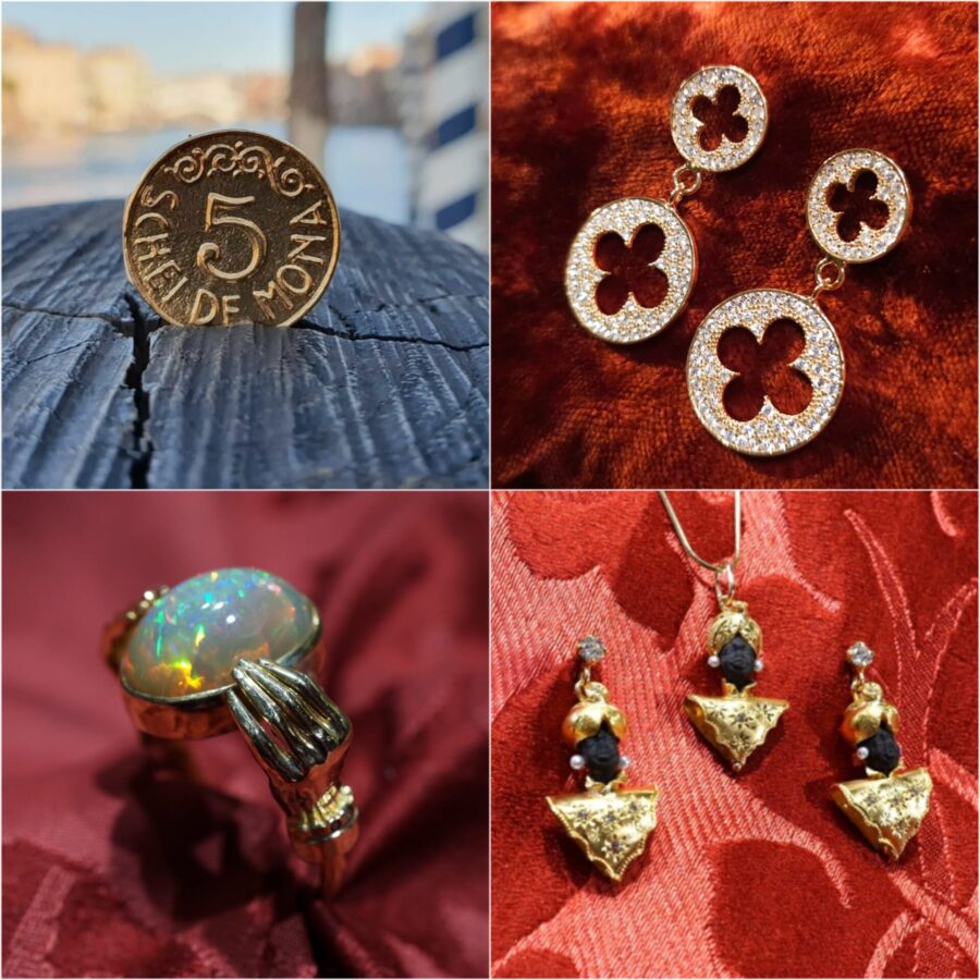 Dalla tipica moneta allegorica 5 schei de mona, agli orecchini quadrilobati, gli anelli con opali e i preziosi Moretti in oro legno ebano.